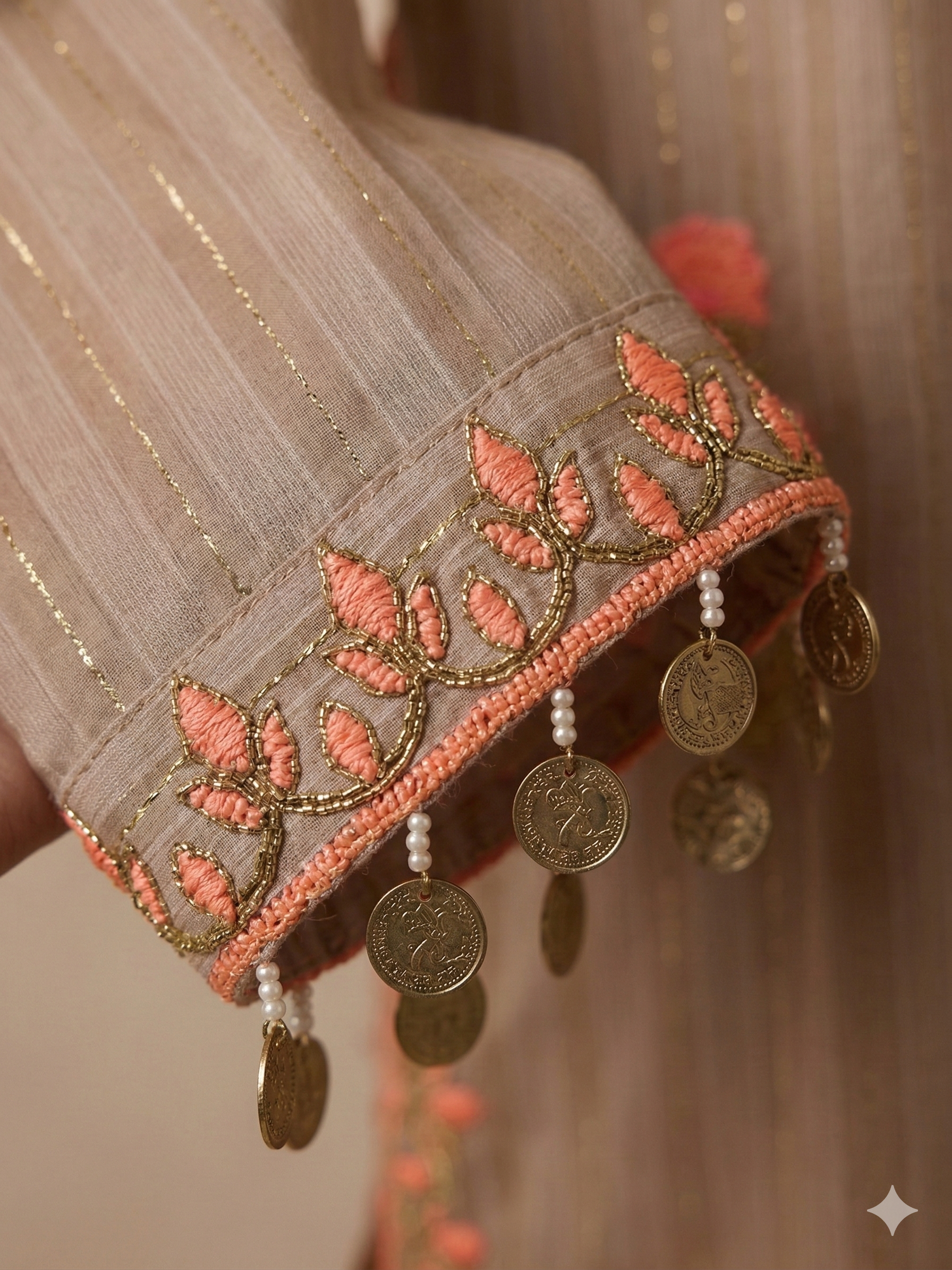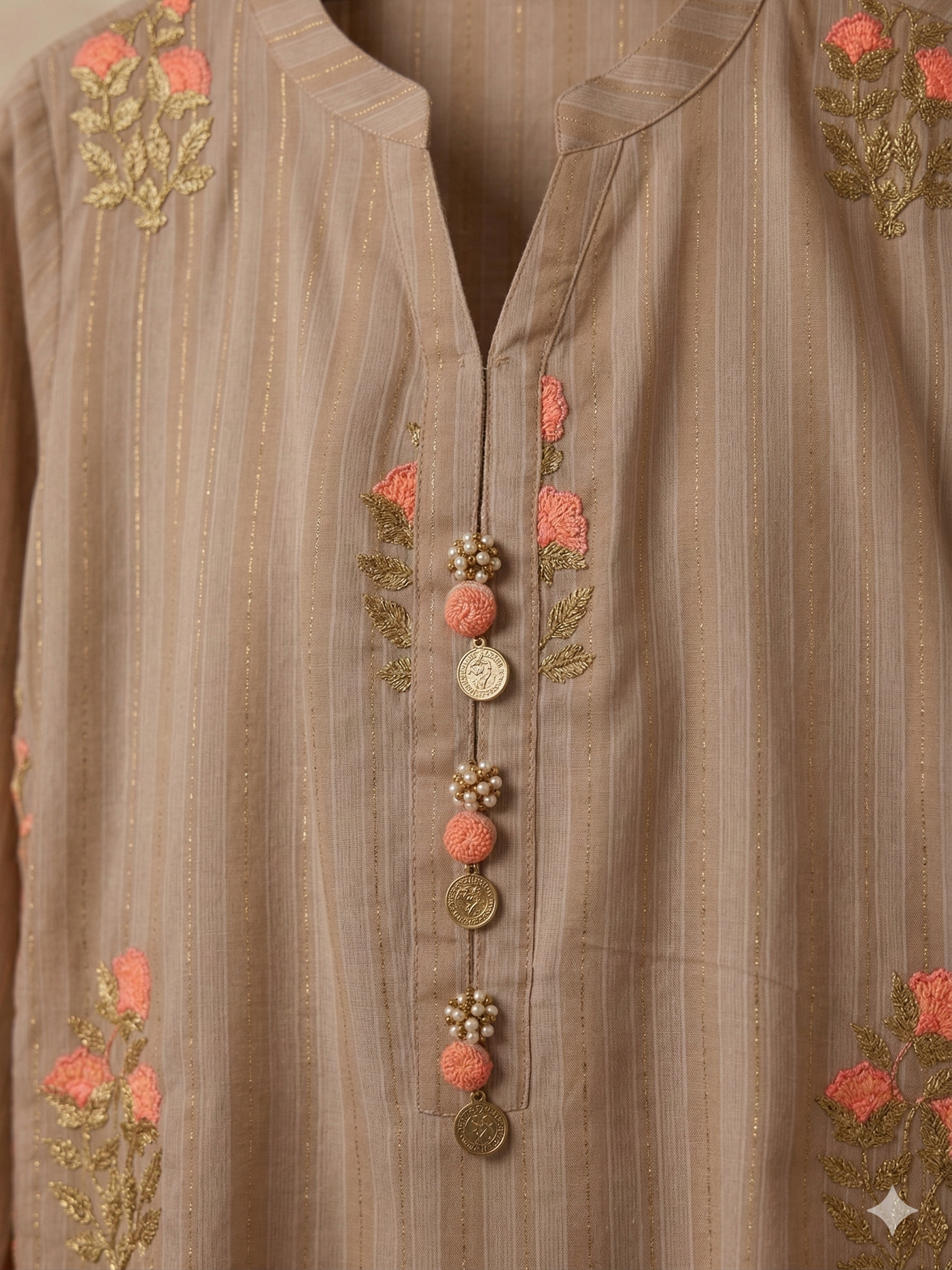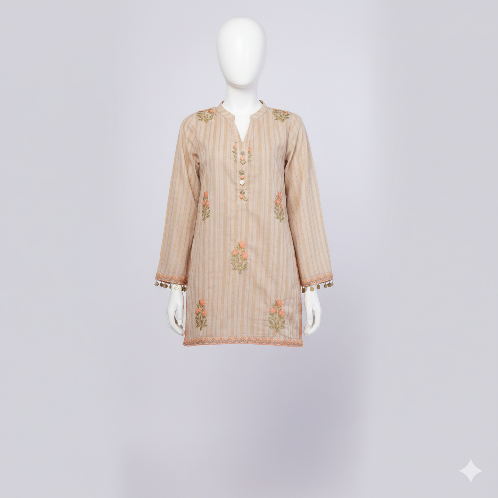 This elegant beige Shirt is floral embroidered, has a band collar with a V-cut.