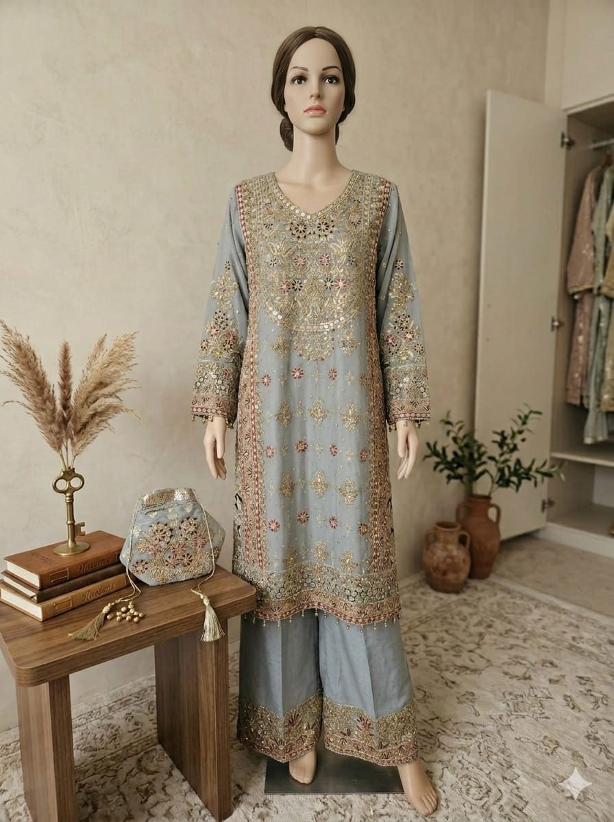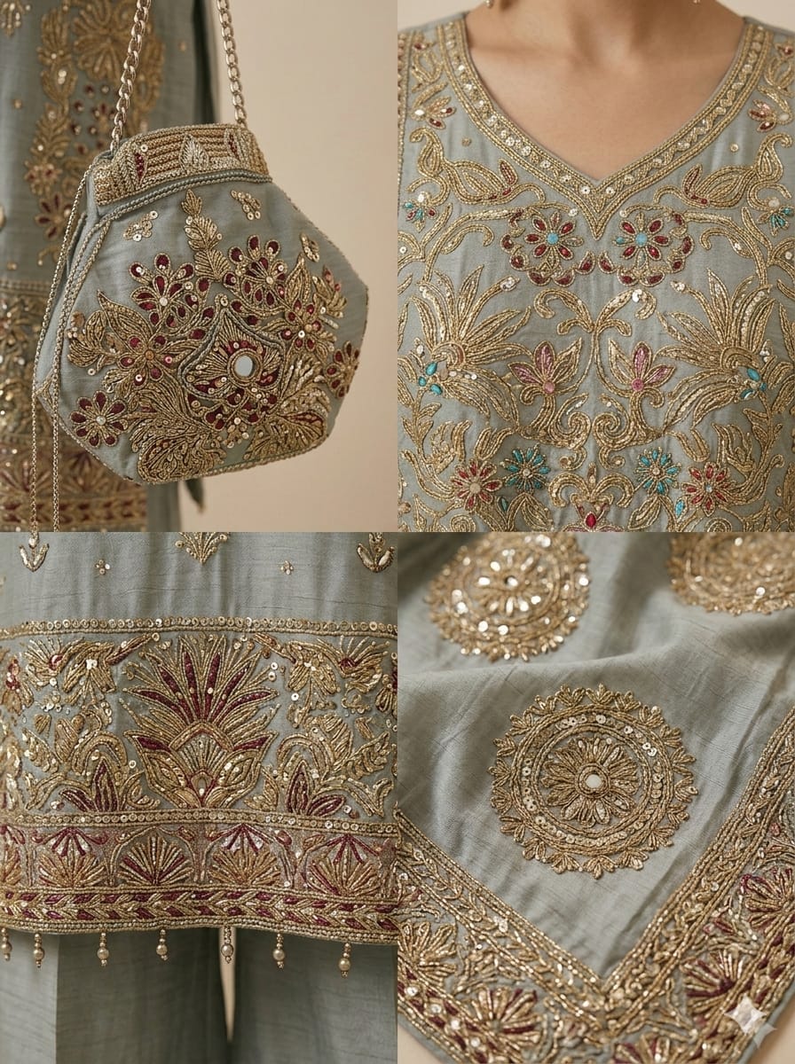 4 piece – top + bottom + dupatta/scarf + pouch